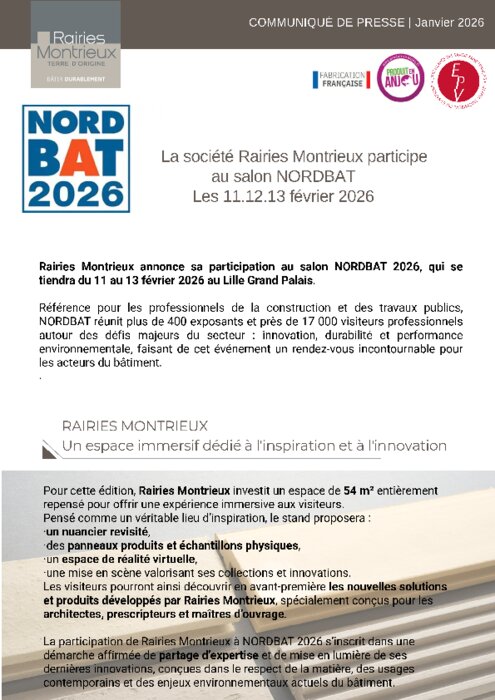 Rairie Montrieux annonce sa participation au salon NORDBAT 2026, qui se tiendra du 11 au 13 février 2026 au Lille Grand Palais. Référence pour les professionnels de la construction et des travaux publics, NORDBAT réunit plus de 400 exposants et près de 17 000 visiteurs professionnels autour des défis majeurs du secteur : innovation, durabilité et performance environnementale, faisant de cet événement un rendez-vous incontournable pour les acteurs du bâtiment.