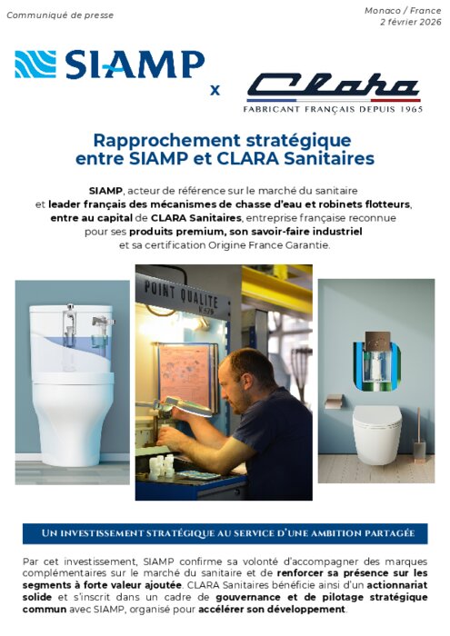 SIAMP, acteur de référence sur le marché du sanitaire et leader français des mécanismes de chasse d’eau et robinets flotteurs, entre au capital de CLARA Sanitaires, entreprise française reconnue pour ses produits premium, son savoir-faire industriel et sa certification Origine France Garantie.