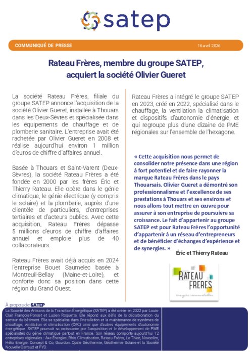 Le groupe SATEP poursuit son développement dans les Deux-Sèvres. Sa filiale, la société Rateau Frères, annonce l’acquisition de la société Olivier Gueret, installée à Thouars et spécialisée dans les équipements de chauffage et de plomberie-sanitaire.
