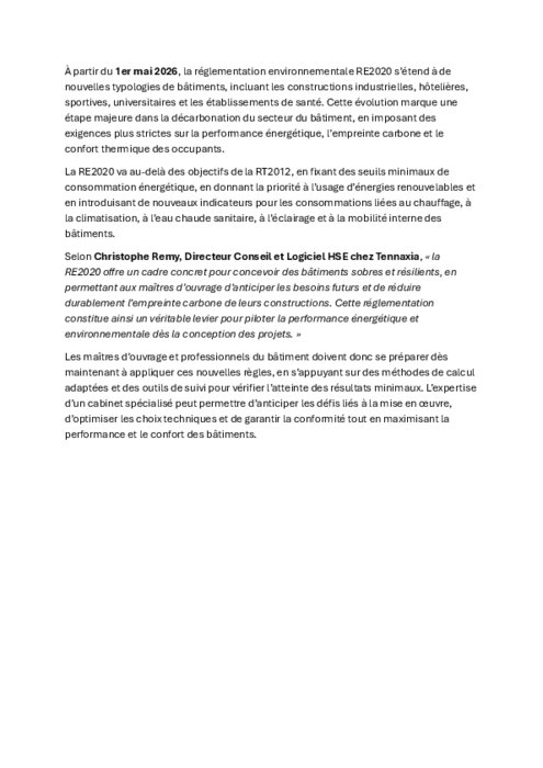 RE2020 – Nouveaux bâtiments concernés dès le 1er mai 2026 (Commentaire Christophe Remy chez Tennaxia)