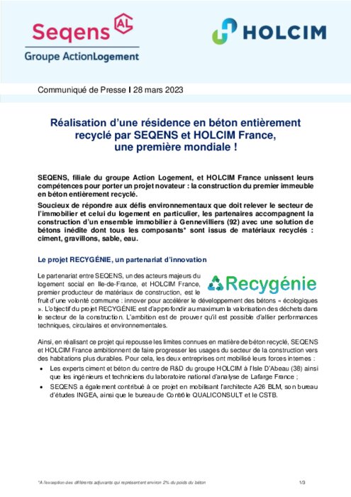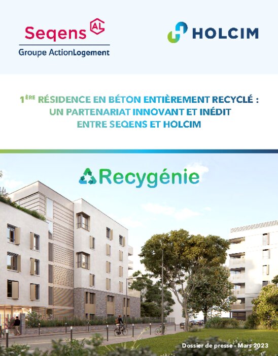 Seqens, filiale du groupe Action Logement, et Holcim unissent leurs compétences pour porter un projet novateur : la construction du premier immeuble en béton entièrement recyclé. Soucieux de répondre aux défis environnementaux que doit relever le secteur de l’immobilier et celui du logement en particulier, les partenaires accompagnent la construction d’un ensemble immobilier à Gennevilliers (92) avec une solution de bétons inédite