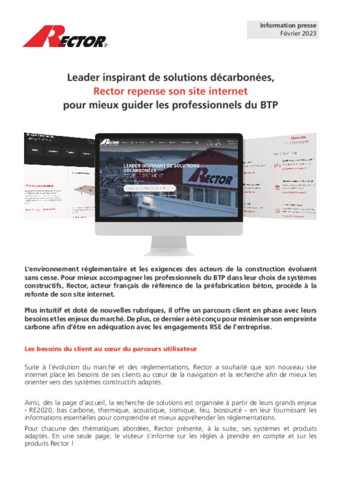 L’environnement réglementaire et les exigences des acteurs de la construction évoluent sans cesse. Pour mieux accompagner les professionnels du BTP dans leur choix de systèmes constructifs, Rector, acteur français de référence de la préfabrication béton, procède à la refonte de son site internet.