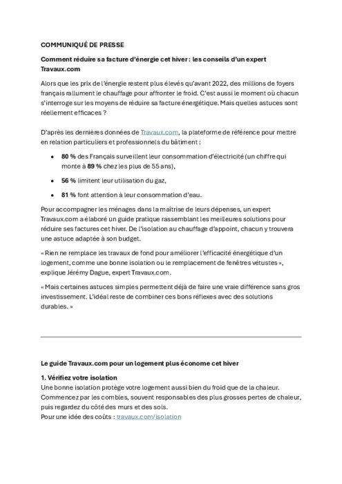 Pour accompagner les ménages dans la maîtrise de leurs dépenses, un expert Travaux.com a élaboré un guide pratique rassemblant les meilleures solutions pour réduire ses factures cet hiver. De l’isolation au chauffage d’appoint, chacun y trouvera une astuce adaptée à son budget.