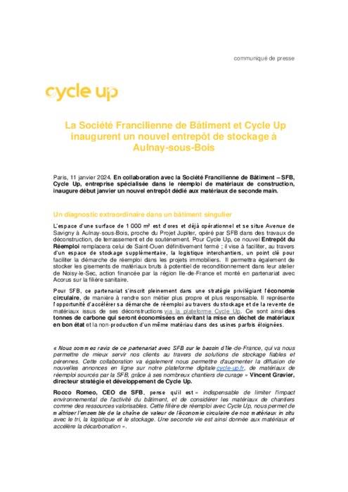 Industriels 11 janvier 2024 - 10:45 En collaboration avec la Société Francilienne de Bâtiment – SFB, Cycle Up, entreprise spécialisée dans le réemploi de matériaux de construction, inaugure début janvier un nouvel entrepôt dédié aux matériaux de seconde main. PDF (225 Ko) Télécharger