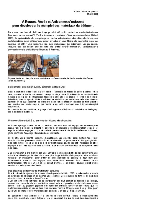 Face à un secteur du bâtiment qui produit 46 millions de tonnes de déchets en France chaque année, Veolia innove en matière d’économie circulaire. Début 2023, le spécialiste du recyclage et de la valorisation des déchets lance une collaboration avec Articonnex pour structurer une filière de réemploi pour ce secteur et offrir une seconde vie aux matériaux du bâtiment. Un an après, l’heure est au bilan sur le site de cette expérimentation, la déchetterie professionnelle de la Barre-Thomas à Rennes.