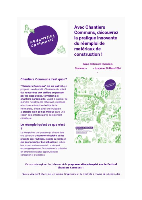 "Chantiers Communs" est un festival qui propose une diversité d'événements, allant des rencontres aux ateliers en passant par les expositions, formations et chantiers participatifs, visant à explorer de manière novatrice les réflexions, initiatives et actions animant les habitants de Normandie, offrant ainsi une invitation à prendre soin de nos milieux dans une région déjà affectée par le dérèglement climatique.