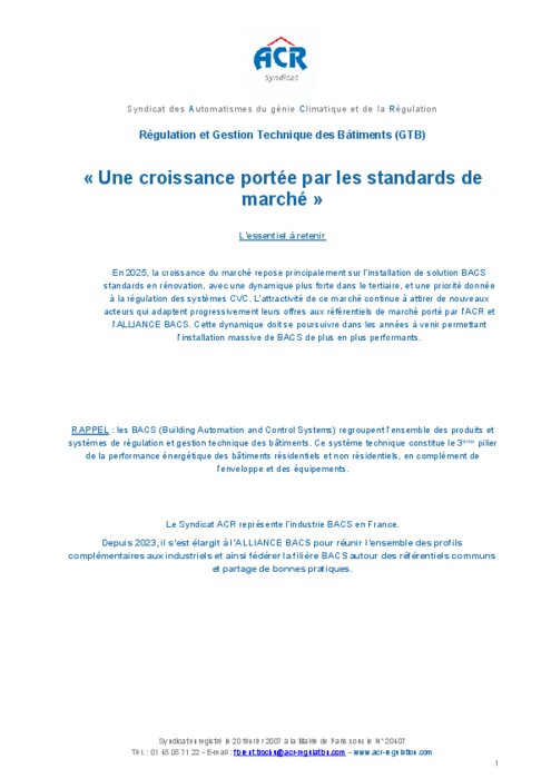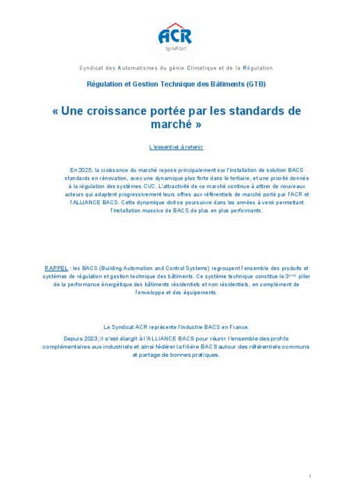 En 2025, la croissance du marché repose principalement sur l’installation de solution BACS standards en rénovation, avec une dynamique plus forte dans le tertiaire, et une priorité donnée à la régulation des systèmes CVC. L’attractivité de ce marché continue à attirer de nouveaux acteurs qui adaptent progressivement leurs offres aux référentiels de marché porté par l’ACR et l’ALLIANCE BACS. Cette dynamique doit se poursuivre dans les années à venir permettant l’installation massive de BACS de plus en plus performants.