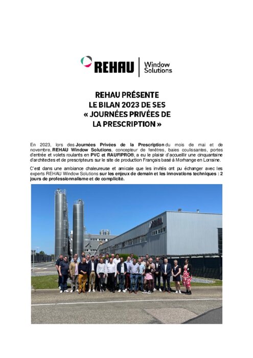 En 2023, lors des Journées Privées de la Prescription du mois de mai et de novembre, REHAU Window Solutions, concepteur de fenêtres, baies coulissantes, portes d’entrée et volets roulants en PVC et RAUFIPRO®, a eu le plaisir d’accueillir une cinquantaine d’architectes et de prescripteurs sur le site de production Français basé à Morhange en Lorraine. C’est dans une ambiance chaleureuse et amicale que les invités ont pu échanger avec les experts REHAU Window Solutions sur les enjeux de demain et les innovations techniques : 2 jours de professionnalisme et de complicité.