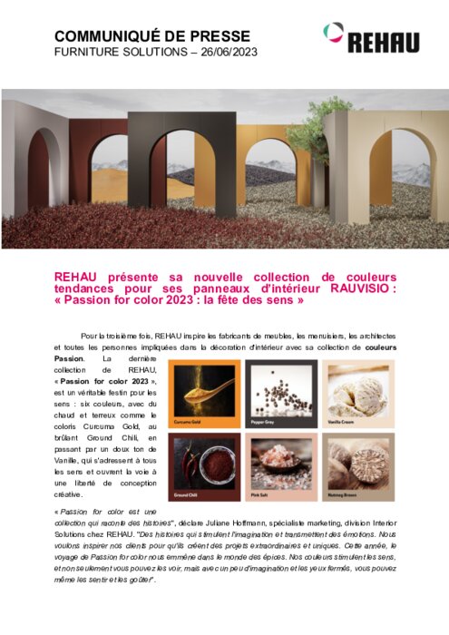 Pour la troisième fois, REHAU inspire les fabricants de meubles, les menuisiers, les architectes et toutes les personnes impliquées dans la décoration d'intérieur avec sa collection de couleurs Passion. La dernière collection de REHAU, « Passion for color 2023 », est un véritable festin pour les sens : six couleurs, avec du chaud et terreux comme le coloris Curcuma Gold, au brûlant Ground Chili, en passant par un doux ton de Vanille.