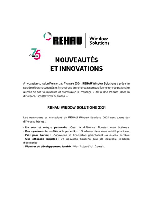 À l’occasion du salon Fensterbau Frontale 2024, REHAU Window Solutions a présenté ses dernières nouveautés et innovations en renforçant son positionnement de partenaire auprès de ses fournisseurs et clients avec le message « All in One Partner. Osez la différence. Boostez votre business. »