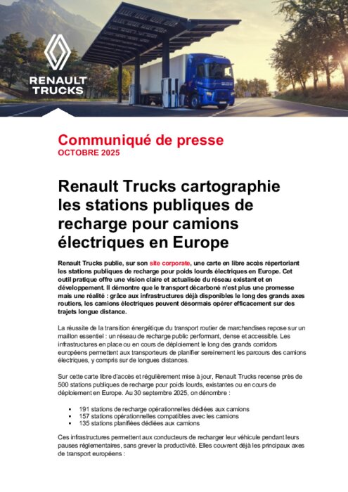 Renault Trucks publie, sur son site corporate, une carte en libre accès répertoriant les stations publiques de recharge pour poids lourds électriques en Europe. Cet outil pratique offre une vision claire et actualisée du réseau existant et en développement. Il démontre que le transport décarboné n’est plus une promesse mais une réalité : grâce aux infrastructures déjà disponibles le long des grands axes routiers, les camions électriques peuvent désormais opérer efficacement sur des trajets longue distance.