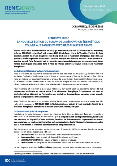 Fort du succès de sa première édition en 2023, qui a rassemblé plus de 5 000 visiteurs et 143 exposants, le forum RENODAYS revient les 7 et 8 octobre 2025 à Paris Expo – Porte de Versailles (Pavillon 6). Cette deuxième édition innove en élargissant son champ d’action à la rénovation énergétique des bâtiments publics et privés : logements individuels et collectifs ainsi que les bâtiments tertiaires . Autre nouveauté : avant sa tenue à Paris, Renodays ira à la rencontre des acteurs régionaux avec un programme de tables rondes thématiques organisées dans 8 villes de France autour des enjeux locaux de la rénovation énergétique.