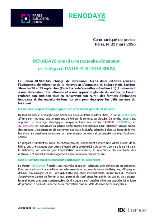 Le Forum RENODAYS change de dimension. Après deux éditions réussies, l’événement de référence de la rénovation s’annualise et intègre Paris Builders Show les 28 et 29 septembre (Paris Porte de Versailles). En s’ouvrant à une dimension internationale et à une approche globale du secteur, le Forum renforce son ambition tout en conservant son ADN : des formats d'échanges innovants et des experts de tous horizons pour décrypter les défis majeurs du bâtiment.