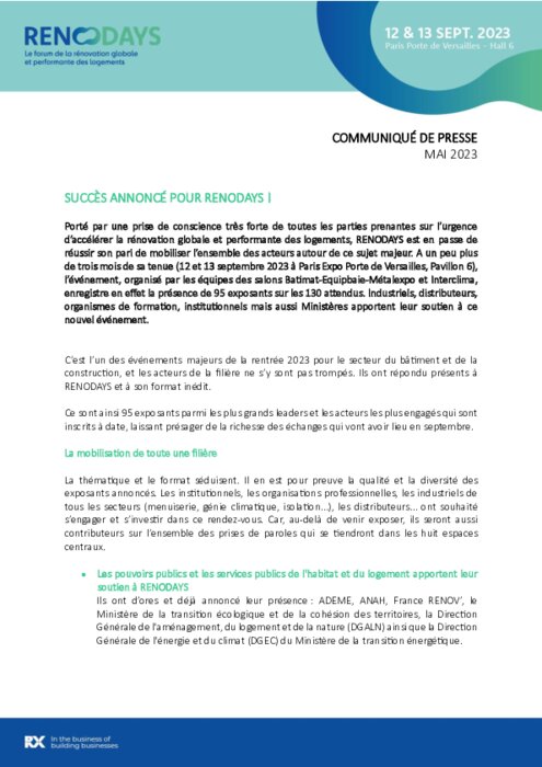 Porté par une prise de conscience très forte de toutes les parties prenantes sur l’urgence d’accélérer la rénovation globale et performante des logements, Renodays est en passe de réussir son pari de mobiliser l’ensemble des acteurs autour de ce sujet majeur, les 12-13 septembre prochain à la porte de Versailles (Paris 15e).