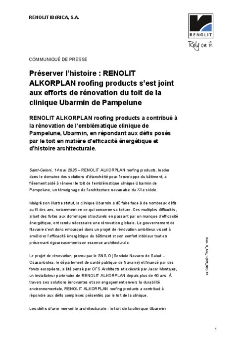 Renolit Alkorplan roofing products, leader dans le domaine des solutions d’étanchéité pour l’enveloppe du bâtiment, a fièrement aidé à rénover le toit de l’emblématique clinique Ubarmin de Pampelune, un témoignage de l’architecture navarraise du XXe siècle.