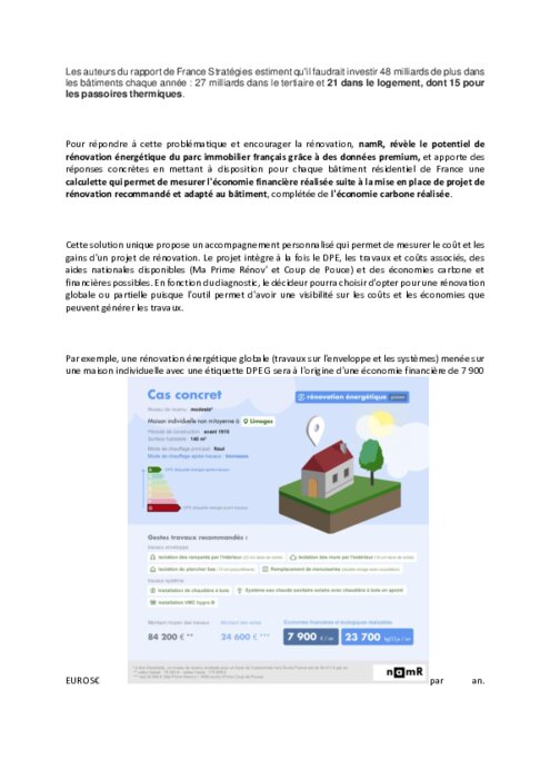 Institutionnels 23 mai 2023 - 14:08 Les auteurs du rapport de France Stratégies estiment qu'il faudrait investir 48 milliards de plus dans les bâtiments chaque année : 27 milliards dans le tertiaire et 21 dans le logement, dont 15 pour les passoires thermiques. PDF (178 Ko) Télécharger