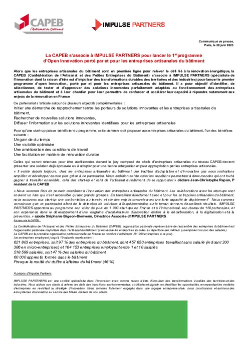 Alors que les entreprises artisanales du bâtiment sont en première ligne pour relever le défi lié à la rénovation énergétique, la CAPEB (Confédération de l'Artisanat et des Petites Entreprises du Bâtiment) s’associe à IMPULSE PARTNERS (spécialiste de l’innovation dont la raison d’être est d’impulser des transformations durables des territoires et des industries) pour lancer le premier programme d’open Innovation, porté par et pour les entreprises artisanales du bâtiment.