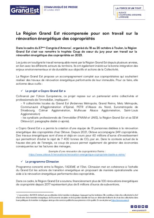 Institutionnels 20 octobre 2023 - 13:45 Dans le cadre du 37ème Congrès d’Amorce, organisé du 18 au 20 octobre à Toulon, la Région Grand Est s’est vue remettre le trophée Coup de cœur du jury pour son travail sur la rénovation énergétique des copropriétés en 2023. PDF (827 Ko) Télécharger