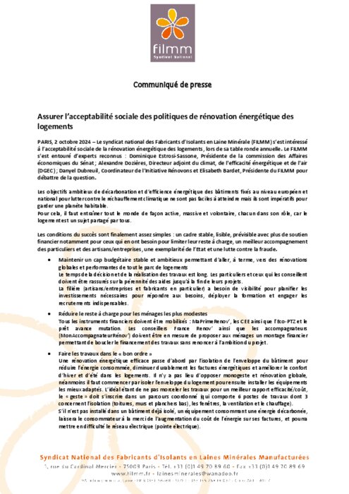Le syndicat national des Fabricants d’Isolants en Laine Minérale (FILMM)s’est intéressé à l’acceptabilité sociale de la rénovation énergétique des logements, lors de sa table ronde annuelle. Le FILMM s’est entouré d’experts reconnus : Dominique Estrosi-Sassone, Présidente de la commission des Affaires économiques du Sénat ; Alexandre Dozières, Directeur adjoint du climat, de l'efficacité énergétique et de l'air (DGEC) ; Danyel Dubreuil, Coordinateur de l’Initiative Rénovons et Elisabeth Bardet, Présidente du FILMM pour débattre de la question.