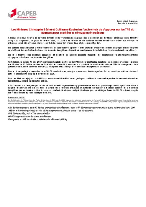 A l’issue des deux heures de travail le Ministre de la Transition écologique et de la cohésion des territoires ainsi qu’avec le Ministre chargé du Logement, ce jeudi 15 février 2024, la CAPEB se félicite de l’importance que les Ministres accordent aux entreprises artisanales du bâtiment pour relever le défi de la rénovation énergétique et de sa massification.