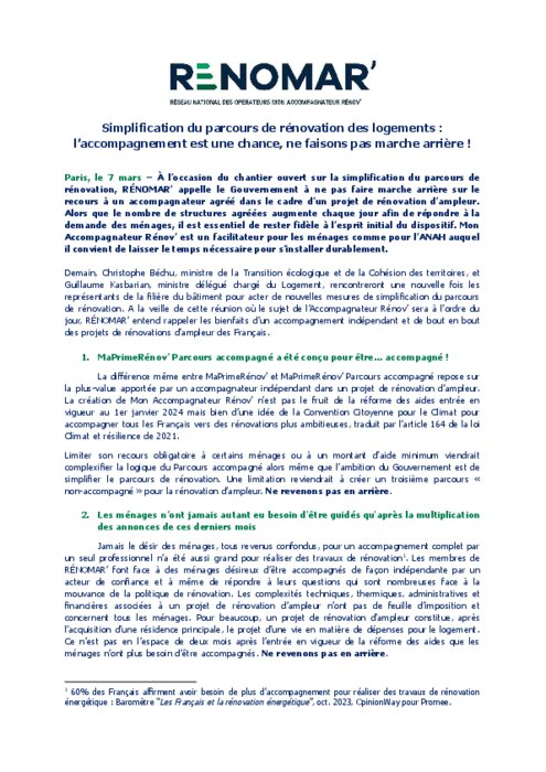 À l’occasion du chantier ouvert sur la simplification du parcours de rénovation, RÉNOMAR’ appelle le Gouvernement à ne pas faire marche arrière sur le recours à un accompagnateur agréé dans le cadre d’un projet de rénovation d’ampleur. Alors que le nombre de structures agréées augmente chaque jour afin de répondre à la demande des ménages, il est essentiel de rester fidèle à l’esprit initial du dispositif. Mon Accompagnateur Rénov’ est un facilitateur pour les ménages comme pour l’ANAH auquel il convient de laisser le temps nécessaire pour s’installer durablement.