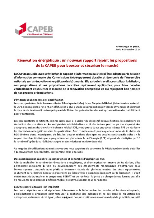 La CAPEB accueille avec satisfaction le Rapport d’information qui vient d’être adopté par la Mission d’information commune des Commissions Développement durable et Economie de l’Assemblée nationale sur la rénovation énergétique des bâtiments. Elle salue le travail accompli par la Mission, son pragmatisme et ses propositions concrètes rapidement applicables, pour faire décoller véritablement et sécuriser le marché de la rénovation énergétique.