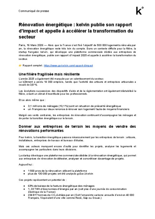 Ce rapport met en lumière la fragilité actuelle de la filière, mais aussi le potentiel concret des professionnels de terrain lorsqu’ils sont mieux équipés : 1 500 professionnels de la rénovation utilisent aujourd’hui kelvin, plus de 130 000 projets ont été analysés grâce à la plateforme, pour 8 Mrds € de travaux générés.