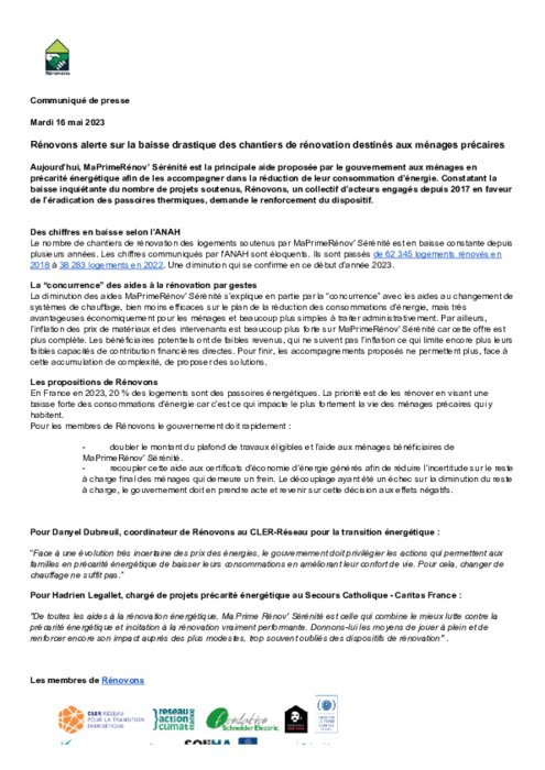 Rénovons alerte sur la baisse drastique des chantiers de rénovation destinés aux ménages précaires