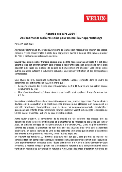 Une étude du BPIE (Buildings Performance Institute Europe) conduite dans le cadre du Baromètre des bâtiments sains 2024 montre que : Les performances des élèves peuvent augmenter de 9 à 18 % avec une exposition accrue