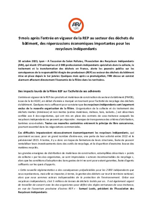 A l’occasion du Salon Pollutec, l’Association des Recycleurs Indépendants (ARI), qui réunit 170 entreprises et 2 000 professionnels indépendants spécialisés dans la collecte, le traitement et la transformation des déchets en France, alerte les pouvoirs publics sur les conséquences de la responsabilité élargie des producteurs (REP) au secteur des déchets du bâtiment mise en place depuis le 1er janvier.