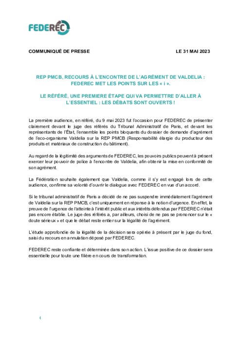 La REP Produits et Matériaux de Construction du Bâtiment (PMCB) représente un bouleversement des procédures de la gestion des déchets du bâtiment qui impacte l’ensemble des parties prenantes. Le temps de la discussion est donc nécessaire. Federec participe activement aux discussions engagées par l’ensemble des éco-organismes ayant obtenu un agrément dans un esprit constructif considérant les intérêts des intervenants historiques, et en vue de la performance de la filière.