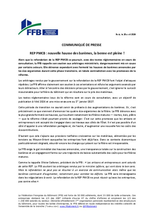 Alors que la refondation de la REP PMCB se poursuit, avec des textes réglementaires en cours de consultation, la FFB rappelle son soutien aux arbitrages ministériels, dangereusement mis en cause par certains acteurs. Elle dénonce cependant avec fermeté les hausses de barèmes annoncées par les éco-organismes durant cette phase transitoire, en totale contradiction avec les promesses de la réforme.
