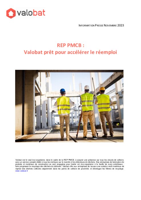 Institutionnels 10 novembre 2023 - 15:45 Valobat est le seul éco-organisme, dans le cadre de la REP PMCB, à assurer une présence sur tous les circuits de collecte, avec un service complet dédié à tous les metteurs sur le marché et les détenteurs de déchets... PDF (392 Ko) Télécharger