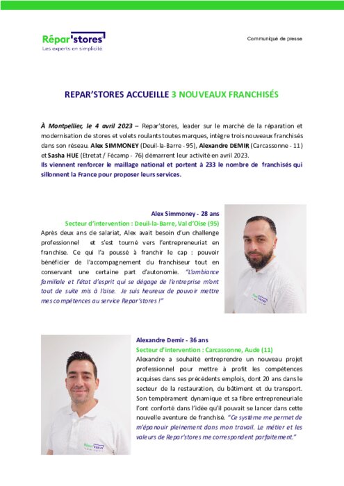 Repar’stores, leader sur le marché de la réparation et modernisation de stores et volets roulants toutes marques, intègre trois nouveaux franchisés dans son réseau. Alex SIMMONEY (Deuil-la-Barre - 95), Alexandre DEMIR (Carcassonne - 11) et Sasha HUE (Etretat / Fécamp - 76) démarrent leur activité en avril 2023.