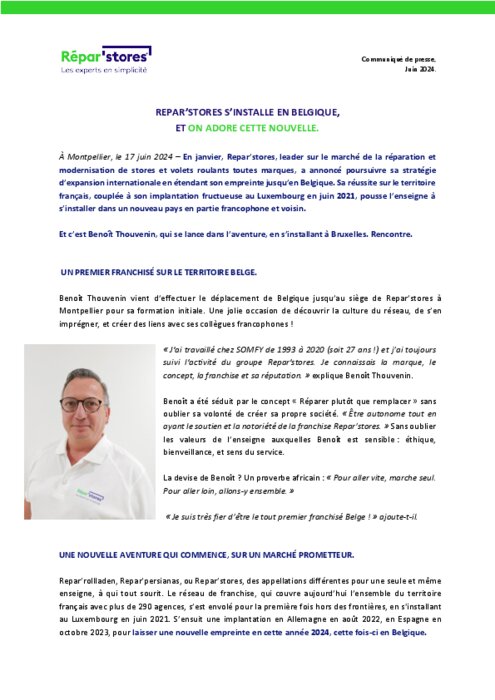 En janvier, Repar’stores, leader sur le marché de la réparation et modernisation de stores et volets roulants toutes marques, a annoncé poursuivre sa stratégie d’expansion internationale en étendant son empreinte jusqu’en Belgique. Sa réussite sur le territoire français, couplée à son implantation fructueuse au Luxembourg en juin 2021, pousse l’enseigne à s’installer dans un nouveau pays en partie francophone et voisin.