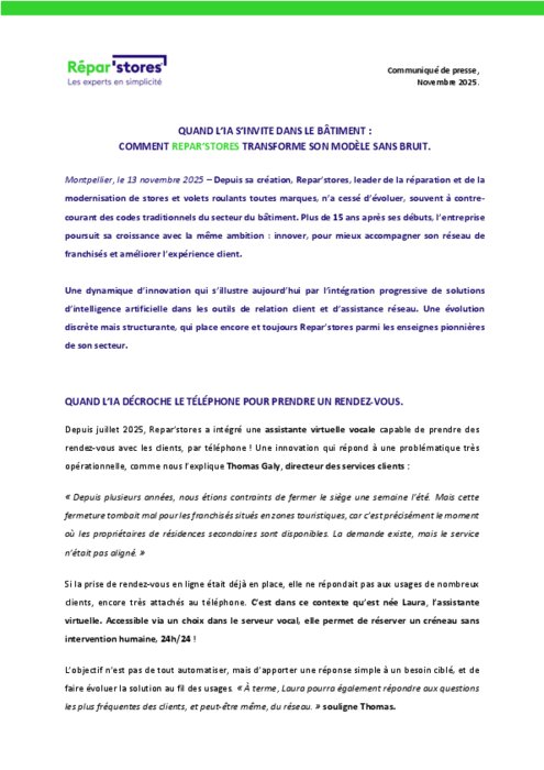 Depuis sa création, Repar’stores, leader de la réparation et de la modernisation de stores et volets roulants toutes marques, n’a cessé d’évoluer, souvent à contre-courant des codes traditionnels du secteur du bâtiment. Plus de 15 ans après ses débuts, l’entreprise poursuit sa croissance avec la même ambition : innover, pour mieux accompagner son réseau de franchisés et améliorer l’expérience client.