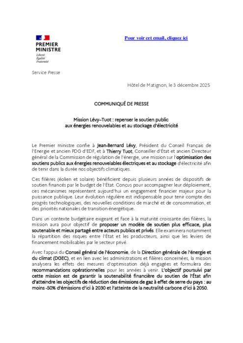 Le Premier ministre confie à Jean-Bernard Lévy, président du Conseil français de l’énergie et ancien PDG d’EDF, et à Thierry Tuot, conseiller d’État et ancien directeur général de la Commission de régulation de l’énergie, une mission sur l’optimisation des soutiens publics aux énergies renouvelables électriques et au stockage d’électricité afin de tenir dans la durée nos objectifs climatiques.