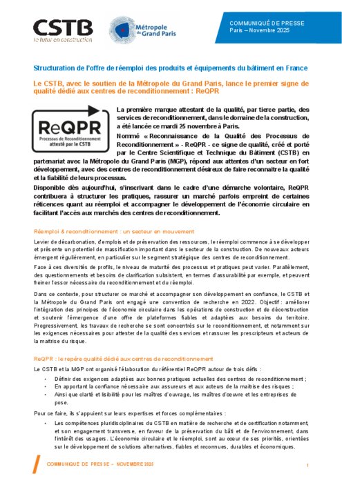 Nommé « Reconnaissance de la Qualité des Processus de Reconditionnement » - ReQPR - ce signe de qualité, créé et porté par le Centre Scientifique et Technique du Bâtiment (CSTB) en partenariat avec la Métropole du Grand Paris (MGP), répond aux attentes d’un secteur en fort développement, avec des centres de reconditionnement désireux de faire reconnaitre la qualité et la fiabilité de leurs processus.