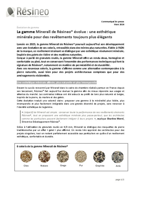 Lancée en 2023, la gamme Minerall de Résineo poursuit aujourd’hui son développement avec une évolution de ses coloris, retravaillés dans des teintes plus naturelles. Fidèle à l’ADN de la marque, ce revêtement drainant se distingue par une esthétique résolument minérale, inspirée des galets de rivière et des matières naturelles.
