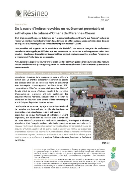 C’est à Marennes-Oléron, sur la terrasse de l’incontournable cabane d’Omer’s, que Résineo a choisi de réaliser un chantier inédit : la rénovation d’une terrasse de 130m2 avec une version chinée à base de nacre de coquilles d’huîtres recyclées de son revêtement phare Résineo Quartz. Une première qui s’appuie sur le savoir-faire de Résinéo, une marque française de revêtements perméables développée par LRVision, qui axe ses travaux de recherche et développement selon deux priorités: développer des revêtements perméables à partir de matières recyclées, sans faire l’impasse sur la résistance et l’esthétisme de ses produits.