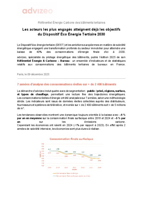 Services 09 décembre 2025 - 15:07 Le Dispositif éco énergie tertiaire (DEET) et les ambitions européennes en matière de sobriété énergétique engagent une transformation profonde du secteur immobilier pour atteindre une baisse de 40% des consommations d'énergie finale d’ici à 2030. PDF (474 Ko) Télécharger credit advizeo