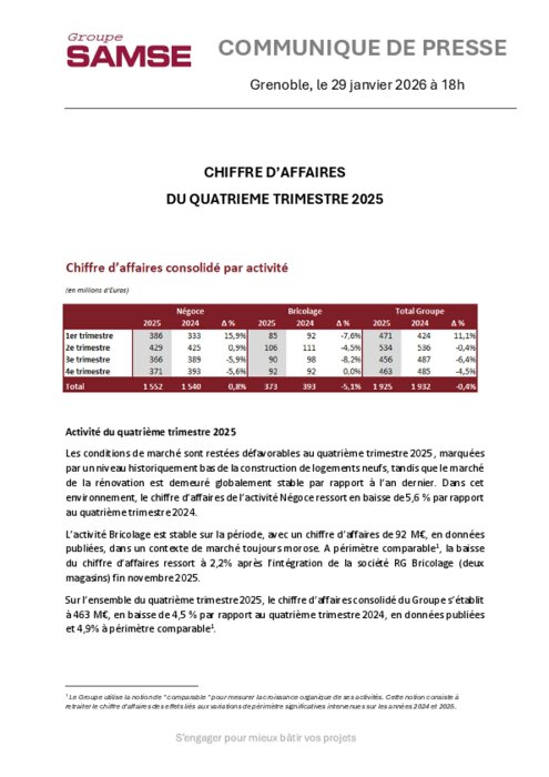 Les conditions de marché sont restées défavorables au quatrième trimestre 2025, marquées par un niveau historiquement bas de la construction de logements neufs, tandis que le marché de la rénovation est demeuré globalement stable par rapport à l’an dernier. Dans cet environnement, le chiffre d’affaires de l’activité Négoce ressort en baisse de 5,6 % par rapport au quatrième trimestre 2024.
