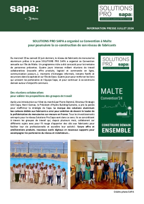 Du mercredi 19 au samedi 22 juin derniers, le réseau de fabricants de menuiseries aluminium prêtes à la pose SOLUTIONS PRO SAPA a organisé sa Convention annuelle sur l’île de Malte. Un programme riche a été concocté pour la trentaine de personnes présentes. Quatre jours intenses mêlant réunions de travail collaboratives (nouvelle offre produits, logiciel et commande en ligne, communication poseurs...), moments d’échanges informels, instants festifs et