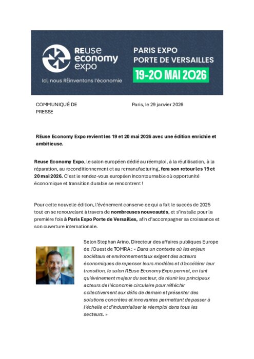 Reuse Economy Expo, le salon européen dédié au réemploi, à la réutilisation, à la réparation, au reconditionnement et au remanufacturing, fera son retour les 19 et 20 mai 2026. C'est le rendez-vous européen incontournable où opportunité économique et transition durable se rencontrent !