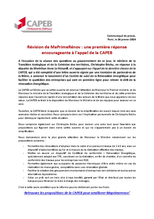 A l’occasion de la séance des questions au gouvernement de ce jour, le ministre de la Transition écologique et de la Cohésion des territoires, Christophe Béchu, en réponse à la députée du Morbihan Anne Le Hénanff, et s’appuyant sur l’appel de la dernière chance de la CAPEB, qui a été complété d’une lettre ouverte signée par une trentaine de partenaires de la filière, a annoncé le lancement d’un Comité de suivi de la Rénovation énergétique pour faciliter le quotidien des entreprises qui sont en première ligne pour relever le défi de la rénovation énergétique.