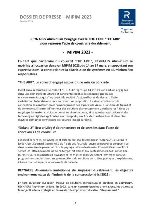 Industriels 10 février 2023 - 09:19 En tant que partenaire du collectif “THE ARK “, REYNAERS Aluminium se mobilise à l’occasion du salon MIPIM 2023, du 14 au 17 mars, en apportant son expertise dans la conception et la distribution de systèmes en aluminium éco responsables. PDF (147 Ko) Télécharger