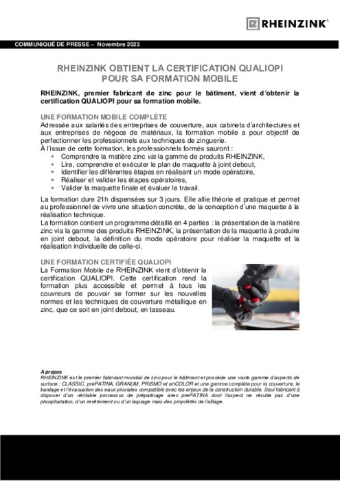 La Formation Mobile de Rheinzink vient d’obtenir la certification Qualiopi. Cette certification rend la formation plus accessible et permet à tous les couvreurs de pouvoir se former sur les nouvelles normes et les techniques de couverture métallique en zinc, que ce soit en joint debout, en tasseau.