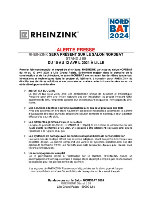 Premier fabricant mondial et expert du zinc-titane, RHEINZINK participe au salon NORDBAT du 10 au 12 avril 2024 à Lille Grand Palais. Evénement majeur dans le domaine de la construction et de l'architecture, le salon NORDBAT met en avant les dernières tendances, innovations et technologies dans le secteur du bâtiment. L’occasion pour RHEINZINK de dévoiler ses dernières solutions et ses avancées en matière de techniques de mise en œuvre et de développement durable.