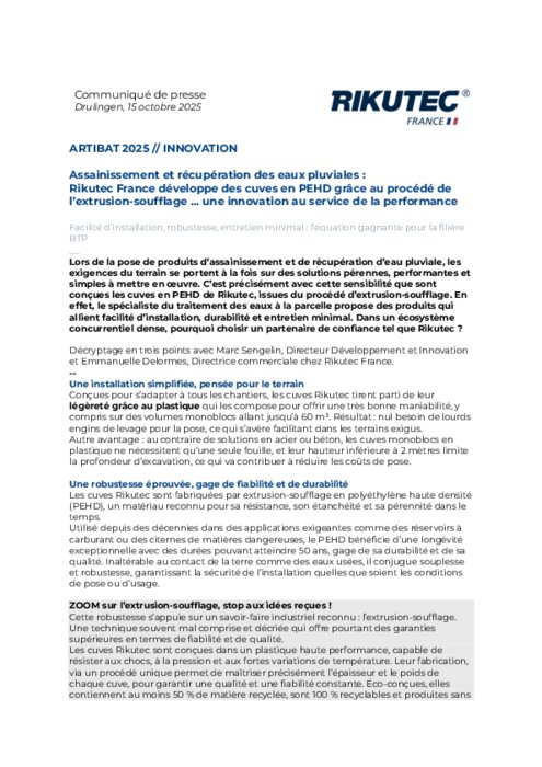 Lors de la pose de produits d’assainissement et de récupération d’eau pluviale, les exigences du terrain se portent à la fois sur des solutions pérennes, performantes et simples à mettre en œuvre. C’est précisément avec cette sensibilité que sont conçues les cuves en PEHD de Rikutec, issues du procédé d’extrusion-soufflage. En effet, le spécialiste du traitement des eaux à la parcelle propose des produits qui allient facilité d’installation, durabilité et entretien minimal.