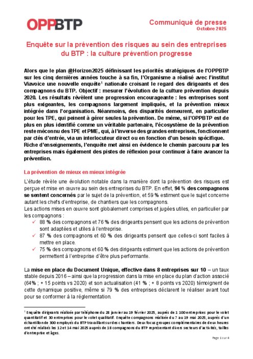 Alors que le plan @Horizon2025 définissant les priorités stratégiques de l’OPPBTP sur les cinq dernières années touche à sa fin, l’Organisme a réalisé avec l’institut Viavoice une nouvelle enquête nationale croisant le regard des dirigeants et des compagnons du BTP. Objectif : mesurer l’évolution de la culture prévention depuis 2020. Les résultats révèlent une progression encourageante : les entreprises sont plus exigeantes, les compagnons largement impliqués, et la prévention mieux intégrée dans l’organisation. Néanmoins, des disparités demeurent, en particulier pour les TPE, qui peinent à gérer seules la prévention. De même, si l’OPPBTP est de plus en plus identifié comme un véritable partenaire, l’écosystème de la prévention reste méconnu des TPE et PME, qui, à l’inverse des grandes entreprises, fonctionnent par clés d’entrée, via un interlocuteur direct ou en fonction d’un besoin spécifique.